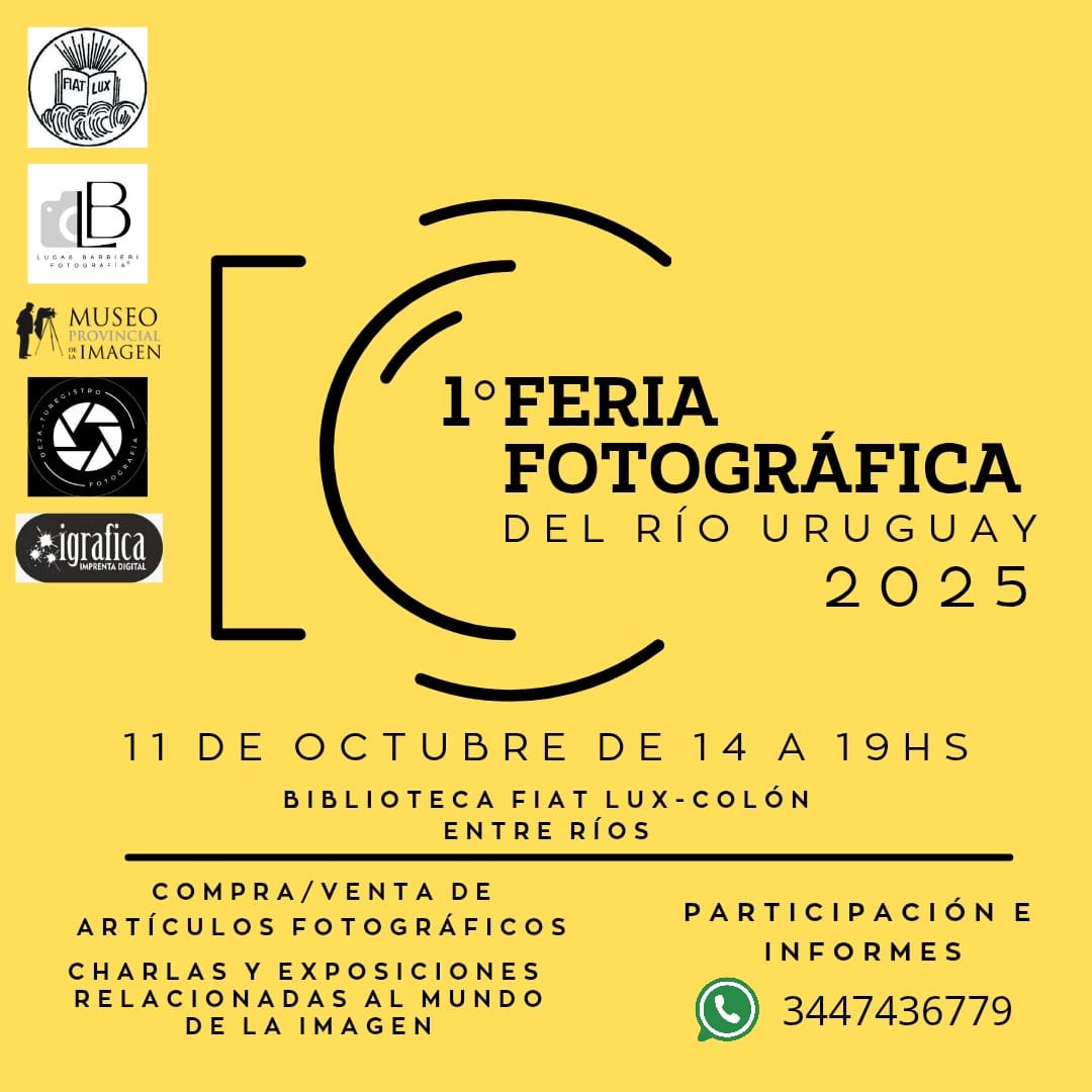 11oct2:00 pm7:00 pm1º FERIA FOTOGRÁFICA DEL RÍO URUGUAY 2025Biblioteca Fiat Lux - Colón