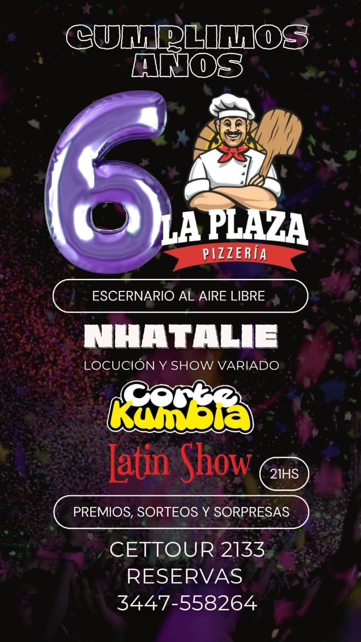 08nov8:00 pm12:00 pmAniversario + show en vivo de corte kumbia y LATIN SHOWPremios, sorteos y sorpresas en pizzería La Plaza