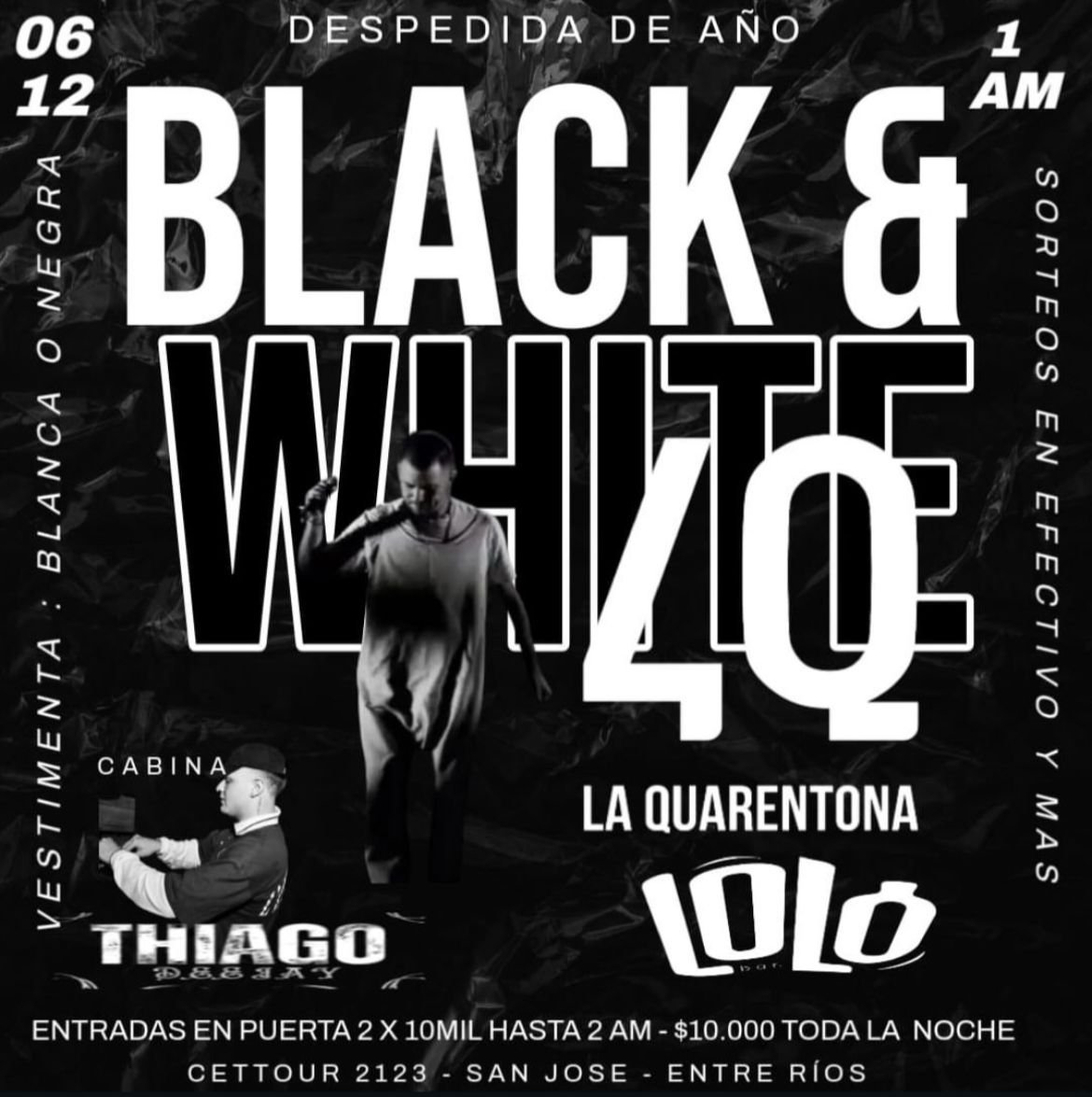 06dec(dec 6)12:00 pm07(dec 7)5:00 amblack & white + show en vivo de la QUARENTONALolo Bar