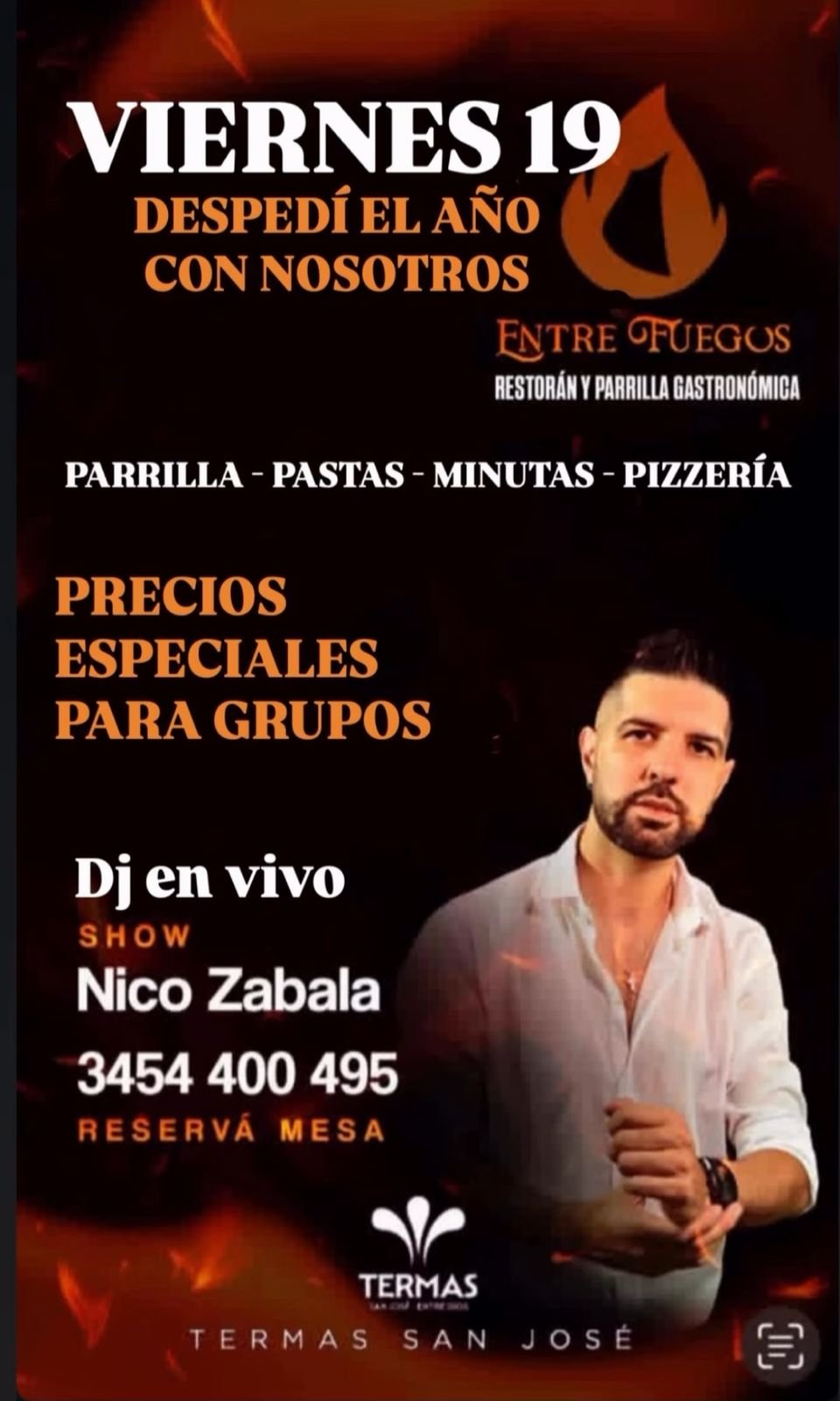 19dec9:00 pm12:00 pmDJ EN VIVO + SHOW DE NICO ZABALARestaurante Entre Fuegos - Termas San José