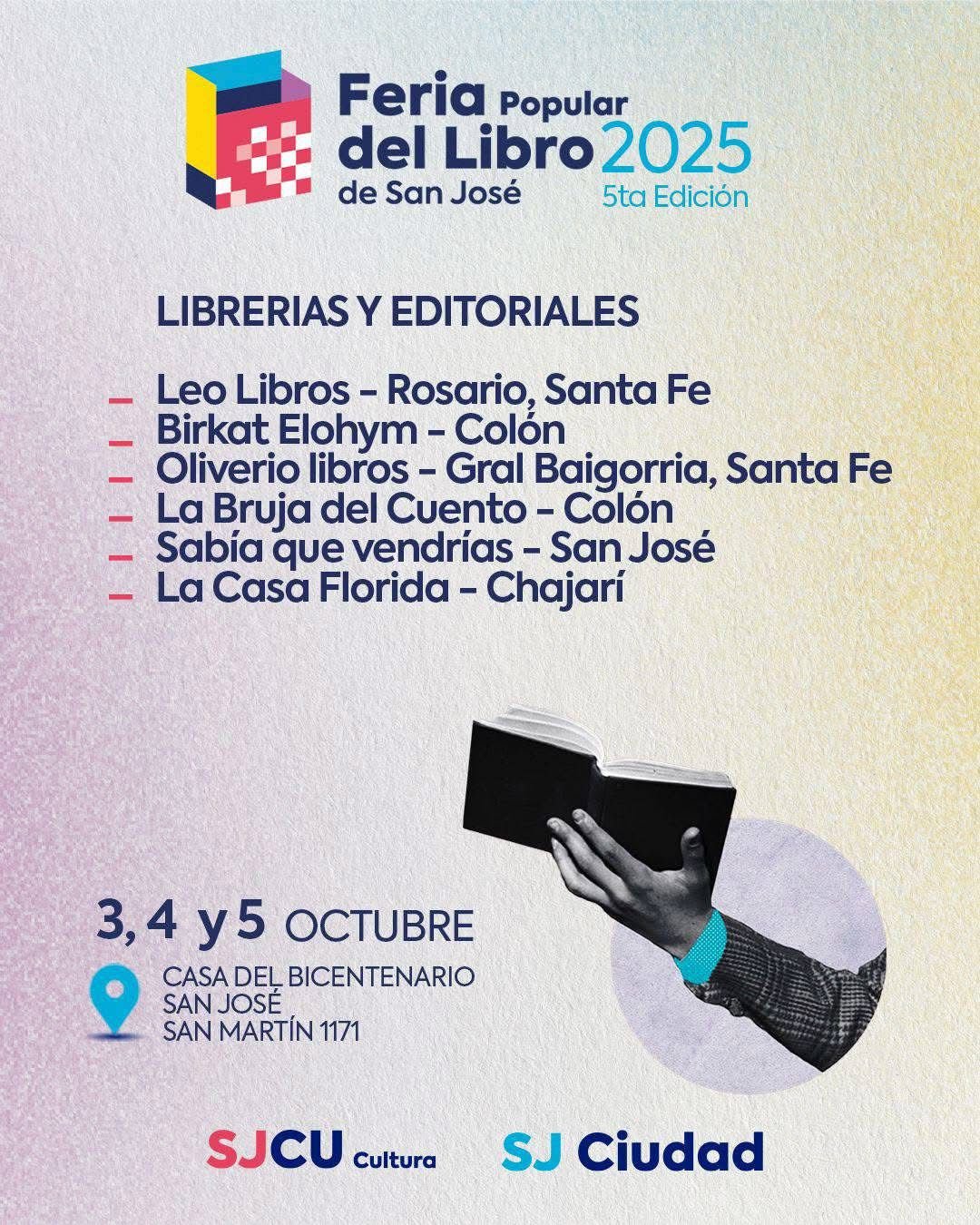 Los días 3, 4 y 5 de octubre la Casa del Bicentenario (San Martín 1171) será sede de una nueva edición de la Feria Popular del Libro de San José, un espacio que ya se ha consolidado como punto de encuentro cultural en la región.