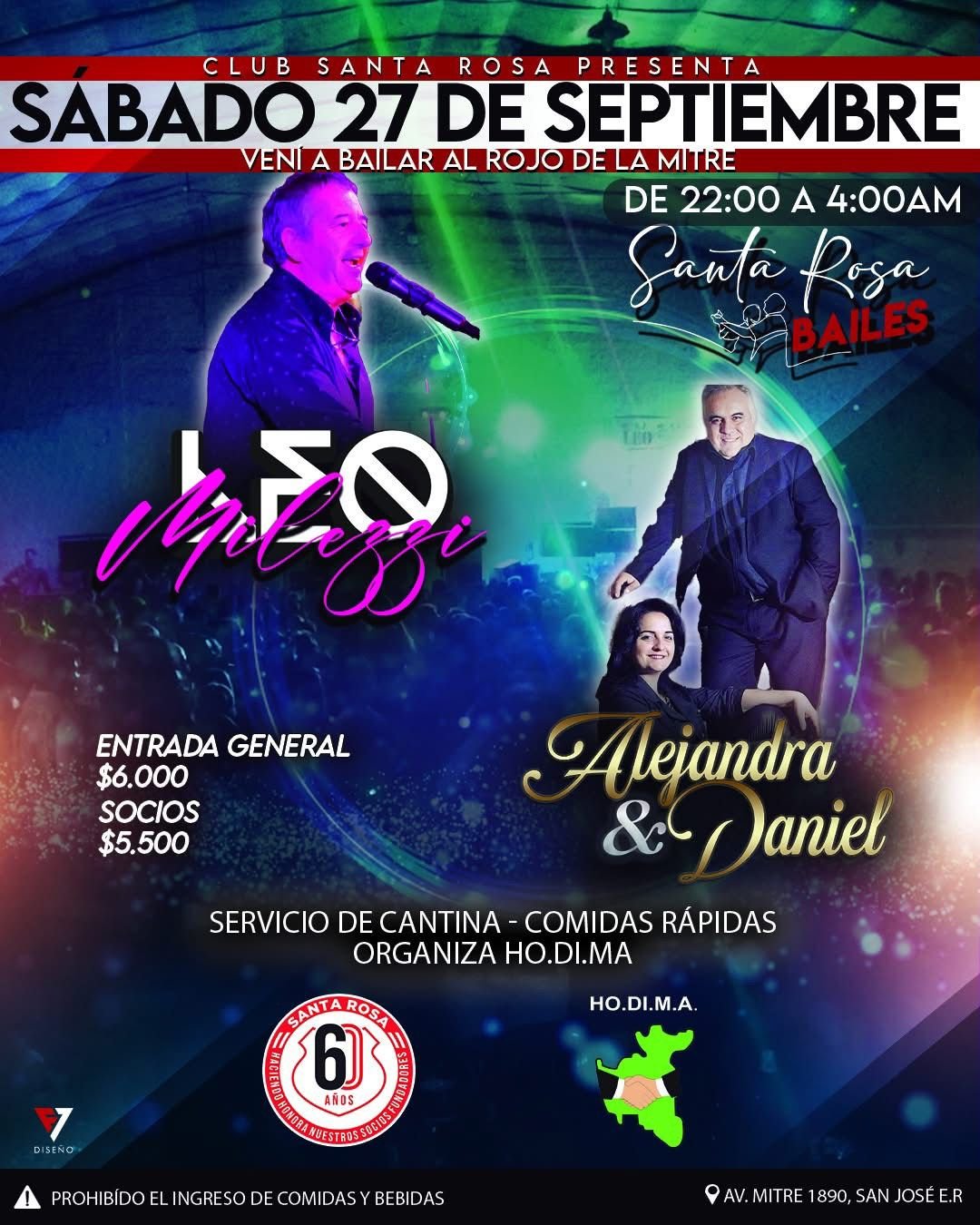 27sep(sep 27)10:00 pm28(sep 28)4:00 amSHOW EN VIVO DE LEO MILEZZI - ALEJANDRA Y DANIELBailable en Club Santa Rosa