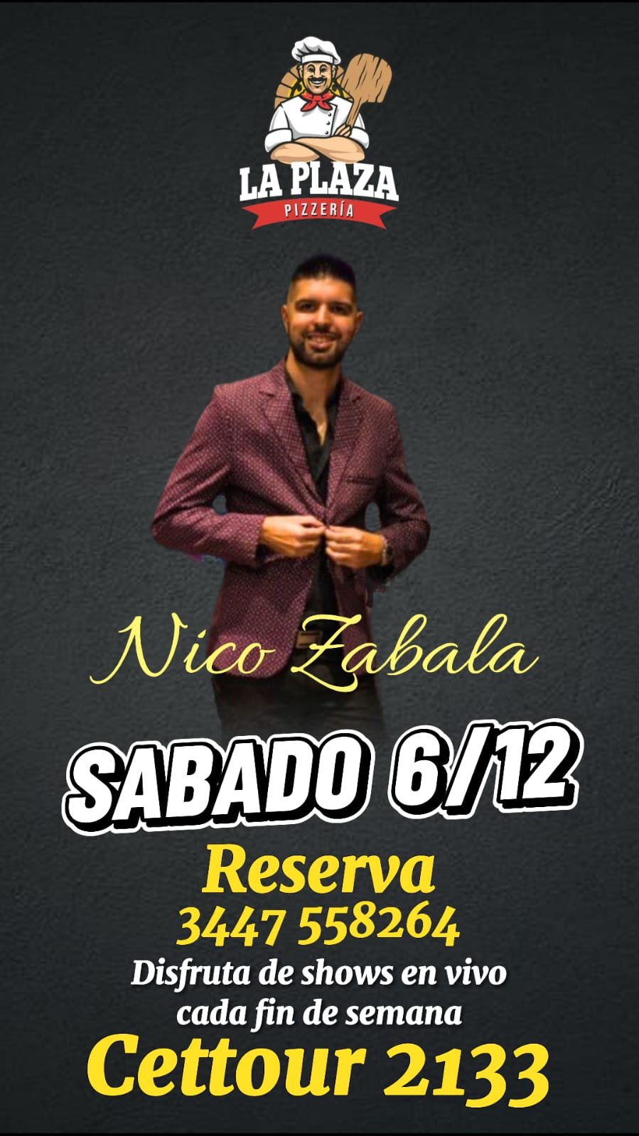 06dec8:00 pm9:30 pmSHOW EN VIVO DE NICO ZABALAPizzería La Plaza