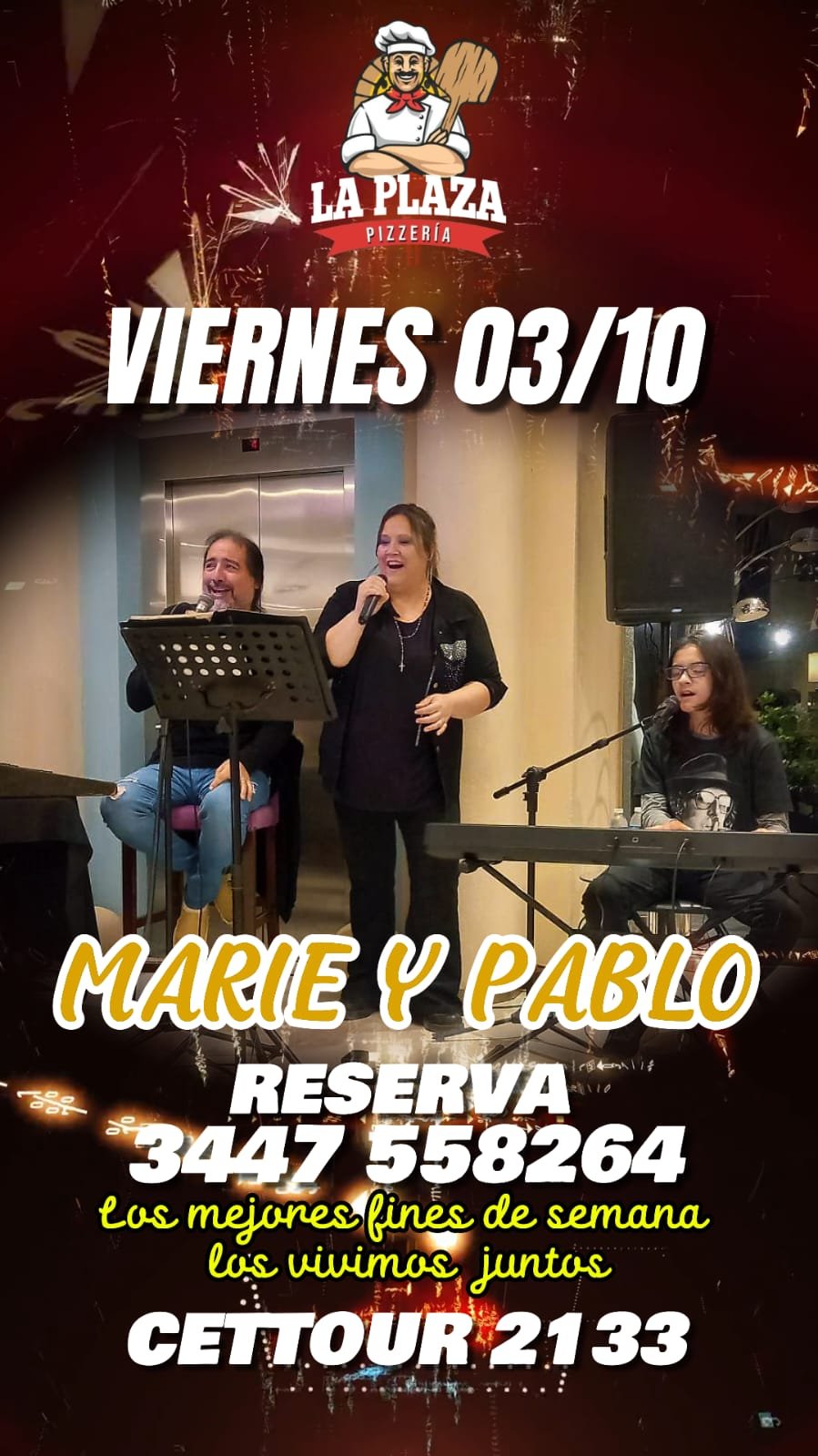 03oct8:00 pm10:00 pmSHOW EN VIVO DE PABLO Y MARIELACena show - Pizzería La Plaza