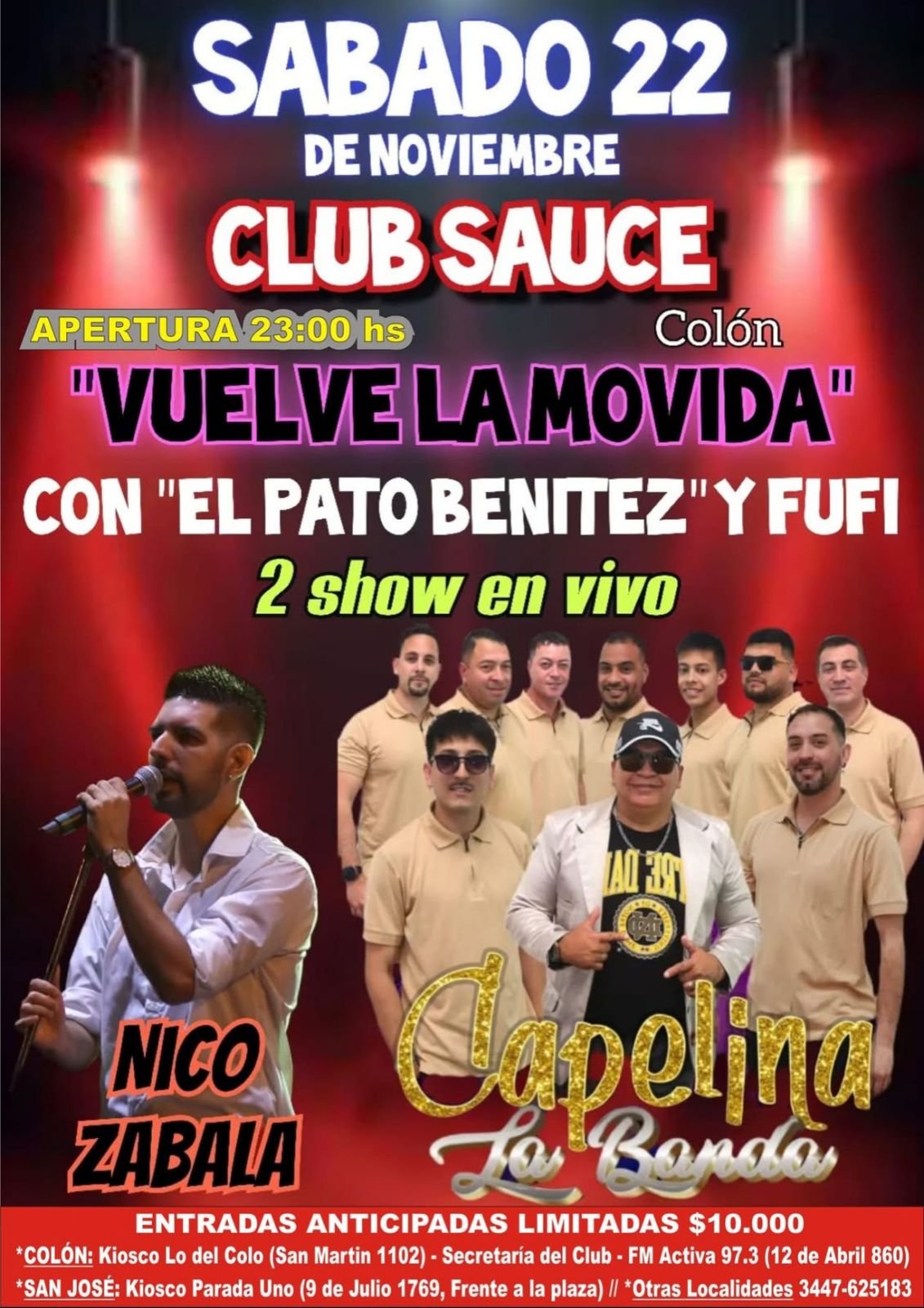 22nov(nov 22)11:00 pm23(nov 23)5:00 amVUELVE LA MOVIDASHow en vivo - Club Sauce - Colón