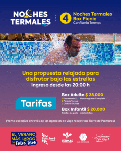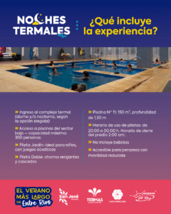 Diseñado por la Secretaría de Turismo, el nuevo programa “Noches Termales” permitirá disfrutar de 4 piletas del parque termal de San José todos los sábados de 20:00 a 00:00 hs., combinando bienestar, gastronomía y naturaleza, pudiendo hacer uso del Predio hasta las 02 de la mañana. La propuesta estará disponible a través de agencias de viajes receptivas de la microrregión, en alianza con concesionarios del complejo. En momentos donde es crucial apoyar al turismo receptivo, que impulsa la economía local al generar ingresos por gastos de turismo, crea empleo y desarrolla nuevos servicios locales.