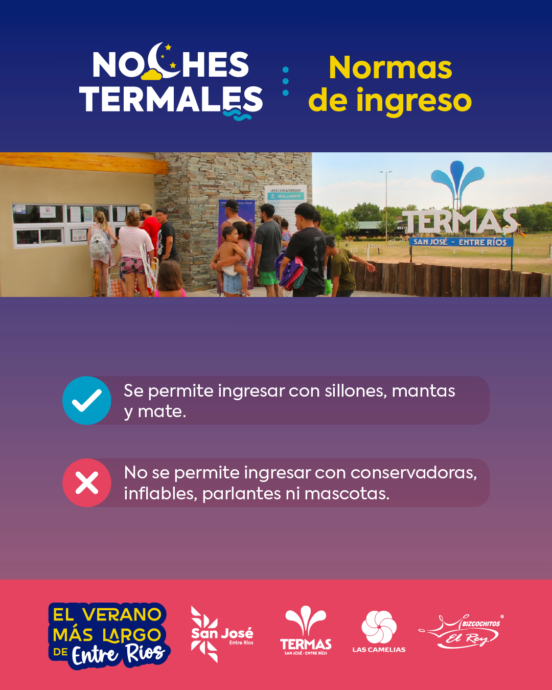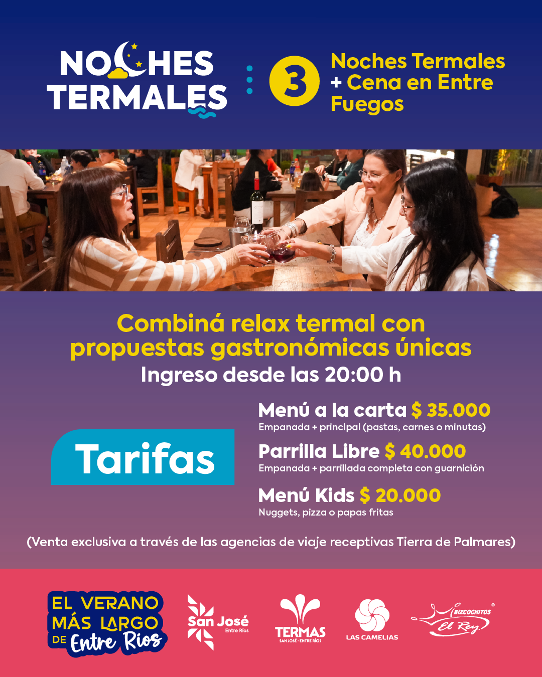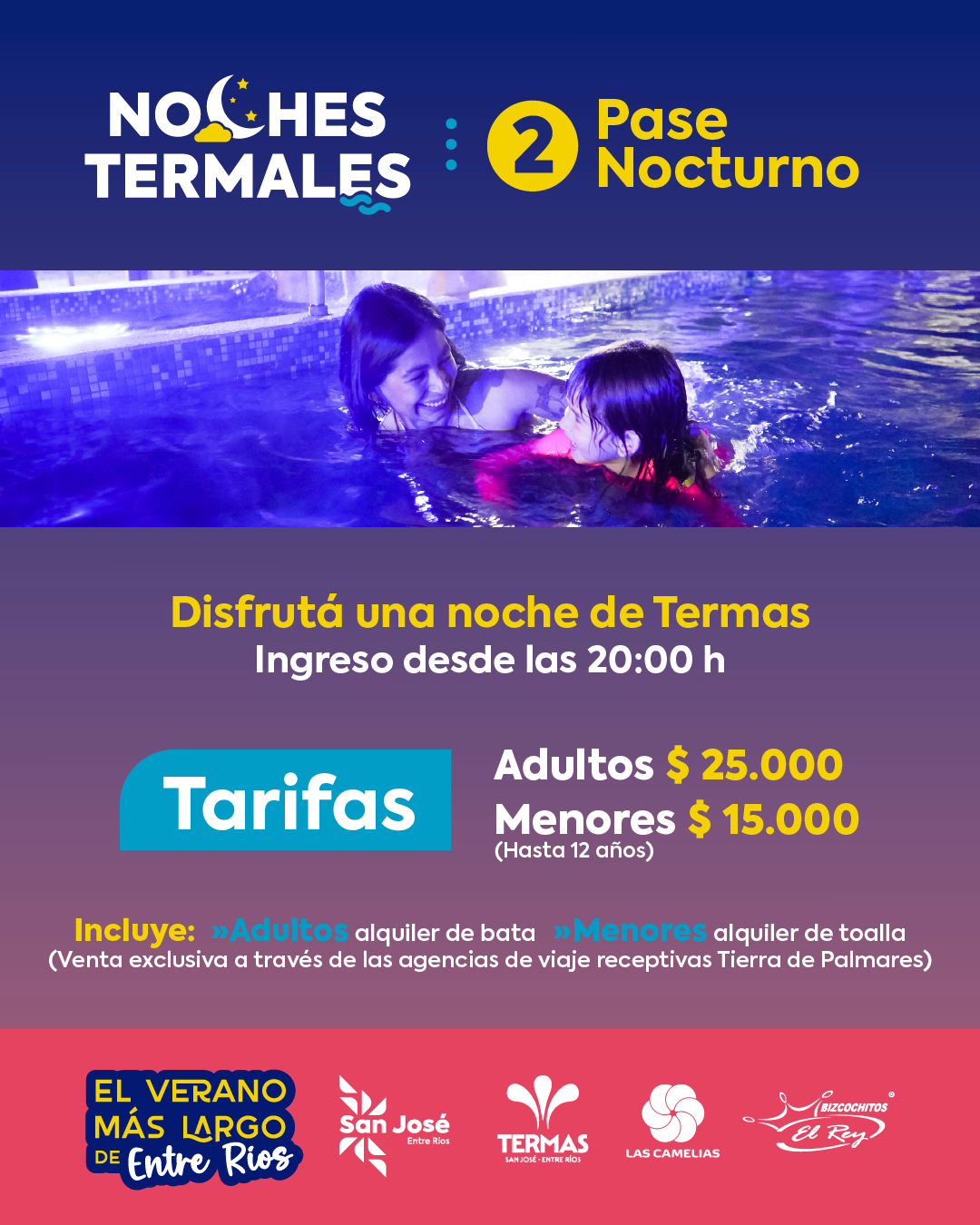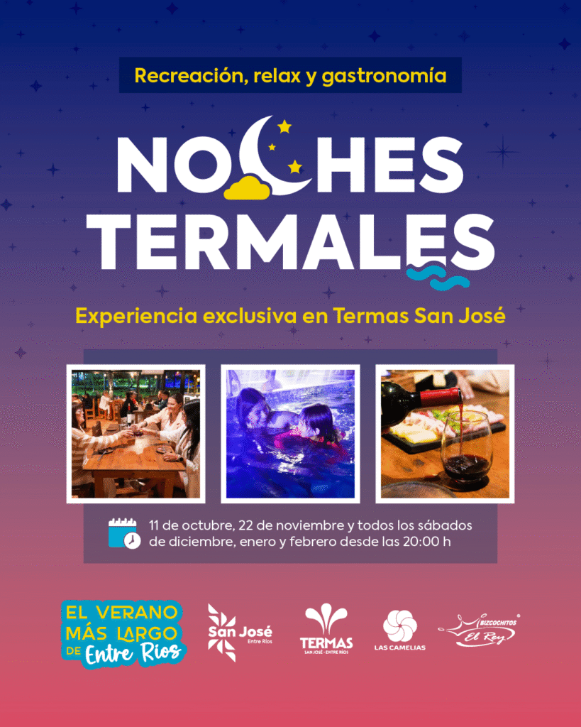 Diseñado por la Secretaría de Turismo, el nuevo programa “Noches Termales” permitirá disfrutar de 4 piletas del parque termal de San José todos los sábados de 20:00 a 00:00 hs., combinando bienestar, gastronomía y naturaleza, pudiendo hacer uso del Predio hasta las 02 de la mañana. La propuesta estará disponible a través de agencias de viajes receptivas de la microrregión, en alianza con concesionarios del complejo. En momentos donde es crucial apoyar al turismo receptivo, que impulsa la economía local al generar ingresos por gastos de turismo, crea empleo y desarrolla nuevos servicios locales.